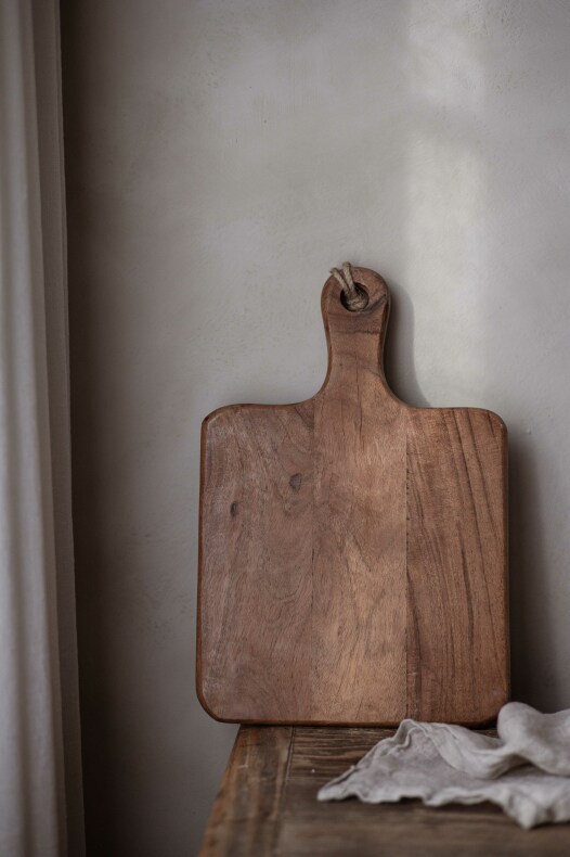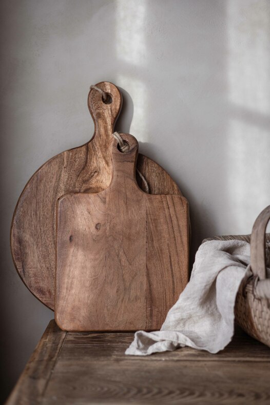 Rund skärbräda i massivt trä med praktiskt handtag och upphängningssnöre | Från Wikholmform
