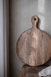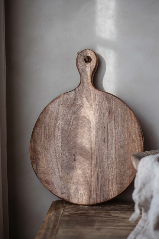 Rund skärbräda i massivt trä med praktiskt handtag och upphängningssnöre | Från Wikholmform