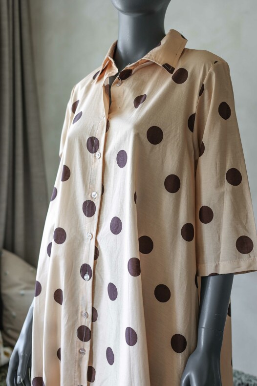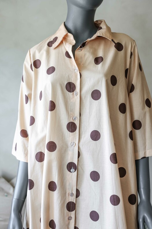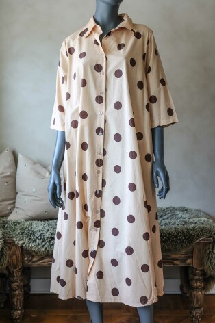 Fin helknäppt klänning med krage och klassiskt prickigt mönster.