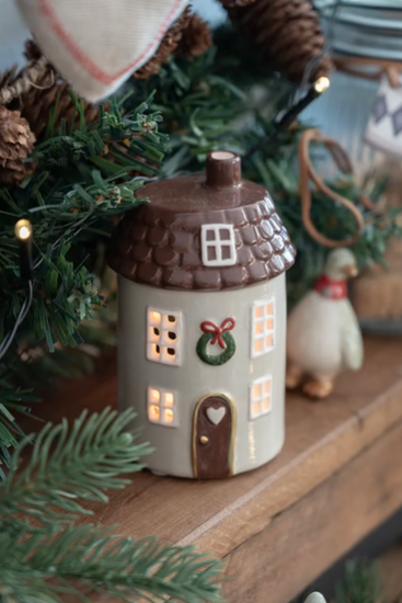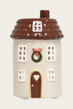 Trendigt danskt keramikhus i rund modell med brun dörr och brunt tak samt julig krans på framsidan, perfekt att dekorera hemmet med i jul! | Från Pop Retail
