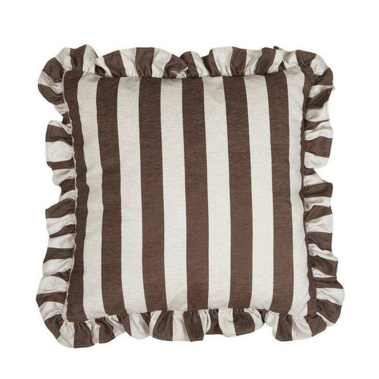 Randigt kuddfodral med sammetseffekt, som kombinerar elegans och mjukhet på ett stilfullt sätt. Kuddfodralets vackra lyster fångar ljuset och ger rummet en varm och inbjudande känsla. Det är även dekorerat med en volang runtom, vilket tillför en romantisk och dekorativ touch. | Från Fondaco