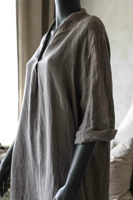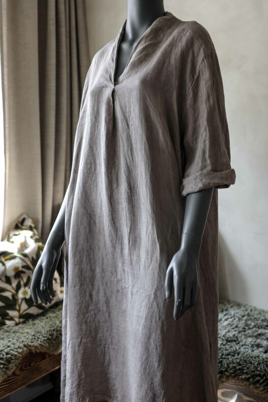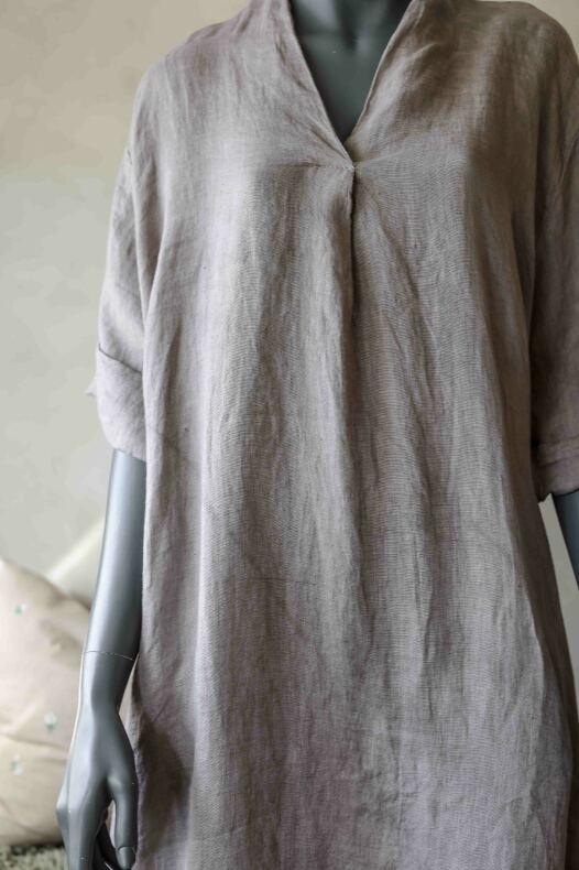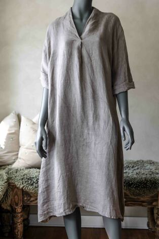 V-halsad linneklänning med fickor.