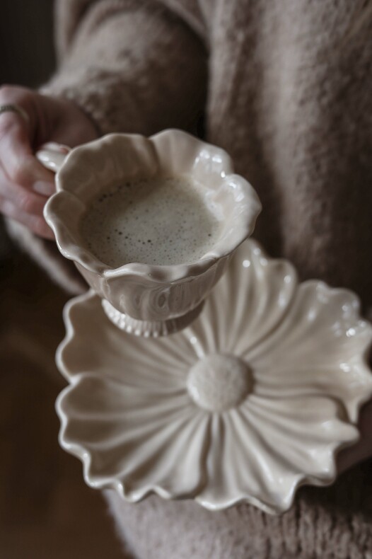 Matcha med muggar och ljusstakar samt söta skålar i samma blommande känsla.