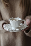Matcha med muggar och ljusstakar samt söta skålar i samma blommande känsla.