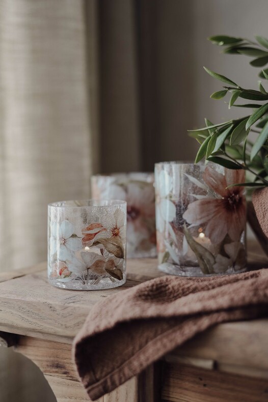 Finish Handgjord krackelerad glaslykta med mönster av vackra blommor och blad i naturens toner