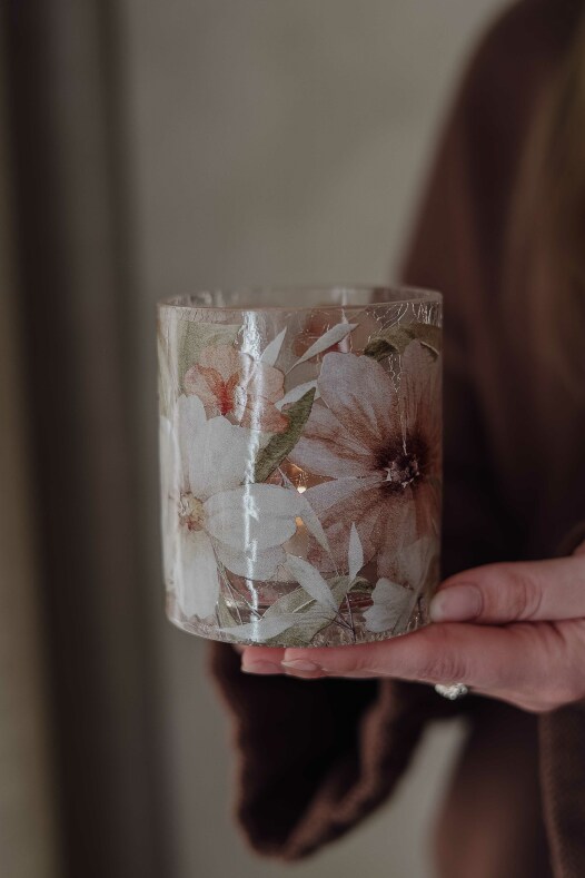 Finish Handgjord krackelerad glaslykta med mönster av vackra blommor och blad i naturens toner