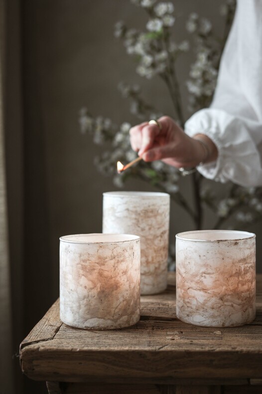 Finish Handgjord glaslykta i vacker vit/sand/grå finish med levande mönstring