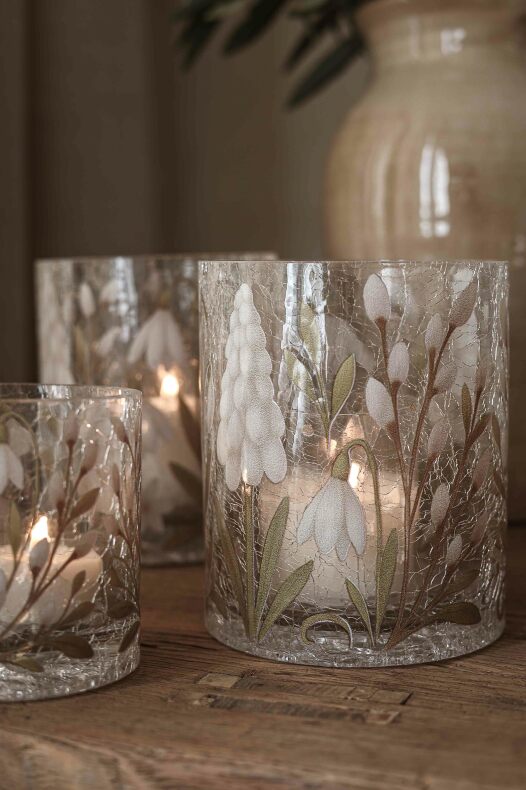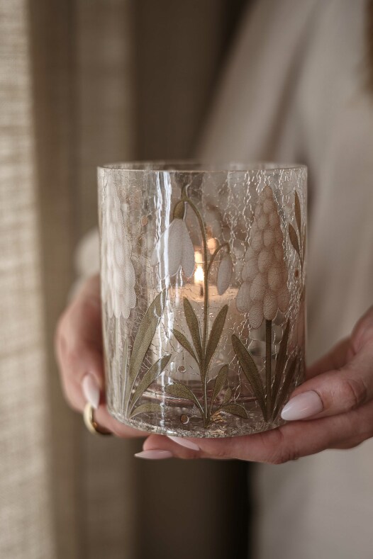 Finish Handgjord krackelerad glaslykta med mönster av vackra Pärlhyacinter, videkvistar och snöklockor.