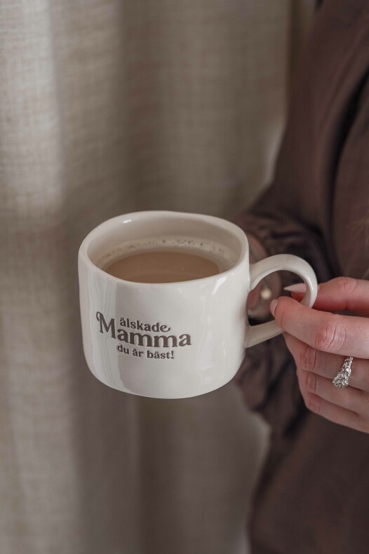Ljuvlig mugg med organisk handgjord känsla och silkscreen text i keramiken.
