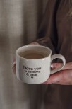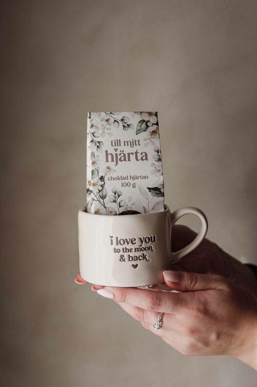 Ljuvlig mugg med organisk handgjord känsla och silkscreen text i keramiken.
