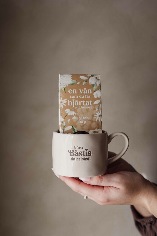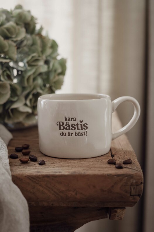 Ljuvlig mugg med organisk handgjord känsla och silkscreen text i keramiken.