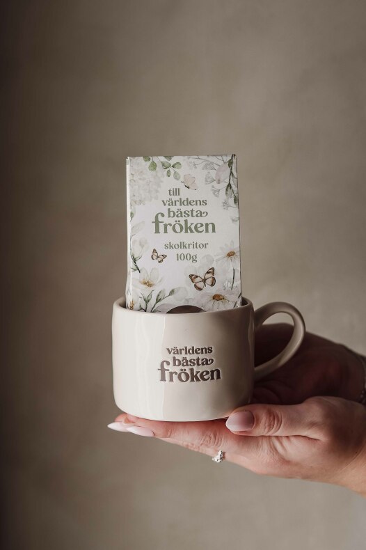 Ljuvlig mugg med organisk handgjord känsla och silkscreen text i keramiken.