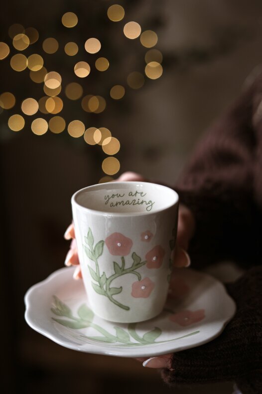 Ljuvlig mugg med handmålat mönster i glada härliga färger