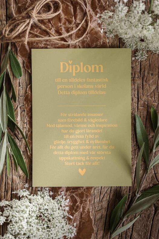 Text: Diplom till en alldeles fantastisk person i skolans värld. Detta diplom tilldelas: ___ För strålande insatser, som förebild & vägledare. Med tålamod, värme och inspiration har du gjort lärandet till en resa fylld av glädje, trygghet & nyfikenhet. För allt du gett under året, får du detta diplom med vår största uppskattning & repsekt. Stort tack för allt!