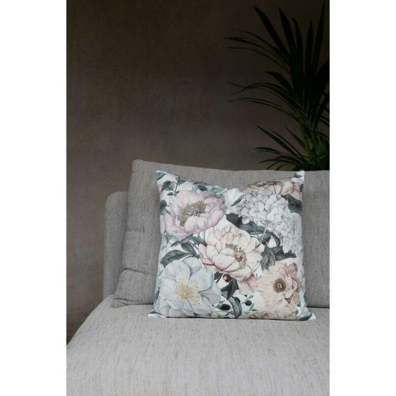 Kuddfodral tillverkad i mjuk, fin sammet med ett uttrycksfullt blommönster med pioner på som ger en romantisk och livfull känsla | Från Fondaco
