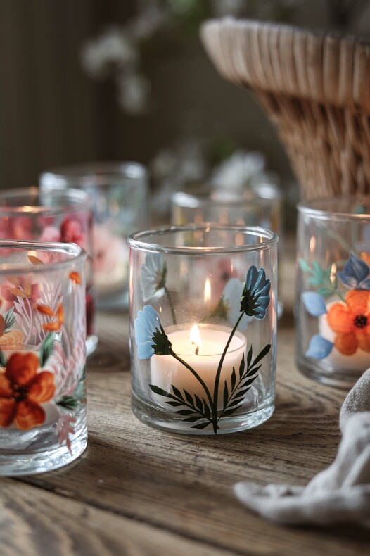 Handmålade blommor i livfulla färger ger denna värmeljushållare en unik och levande karaktär. Varje exemplar är ett litet hantverk som sprider värme och stämning – lika vacker på egen hand som en färgstark och personlig detalj i ditt hem. | Från IB Laursen