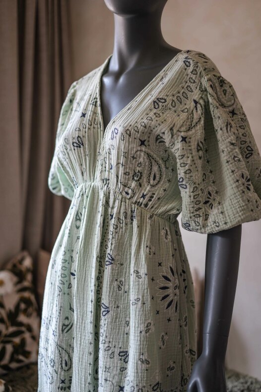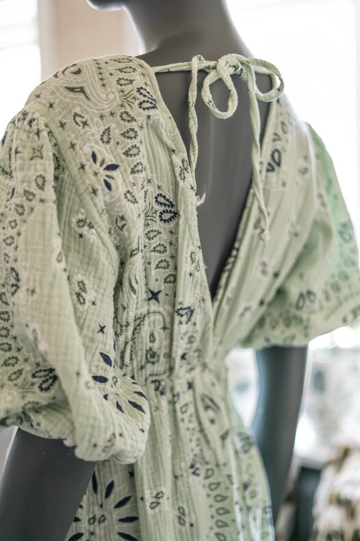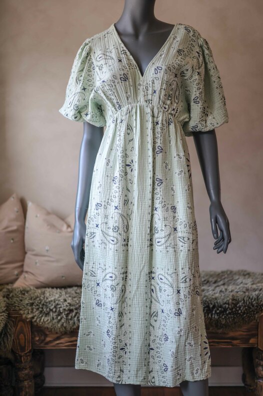 Ljuvlig sommarklänning med snyggt mönster! V-ringad framtill och knyte i ryggen.